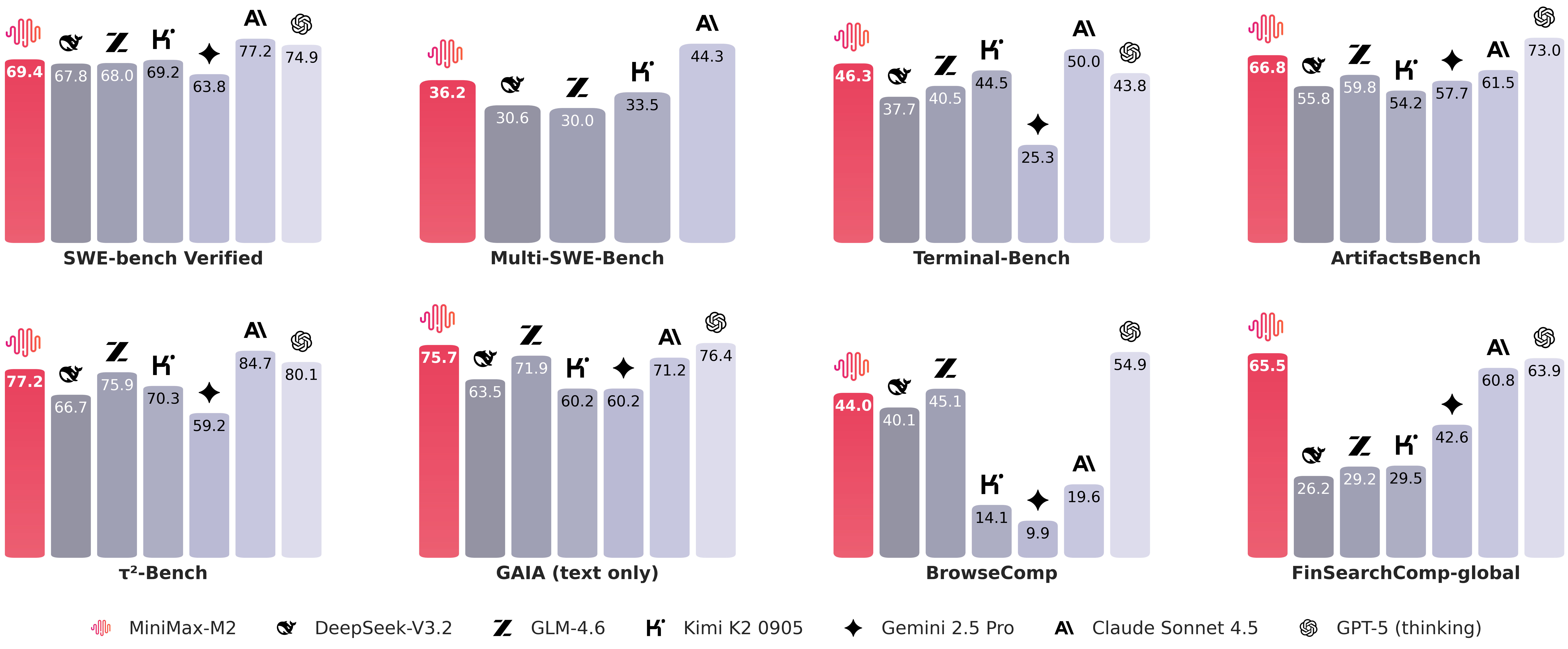 | Benchmark | MiniMax-M2 | Claude Sonnet 4 | Claude Sonnet 4.5 | Gemini 2.5 Pro | GPT-5 (thinking) | GLM-4.6 | Kimi K2 0905 | DeepSeek-V3.2 |