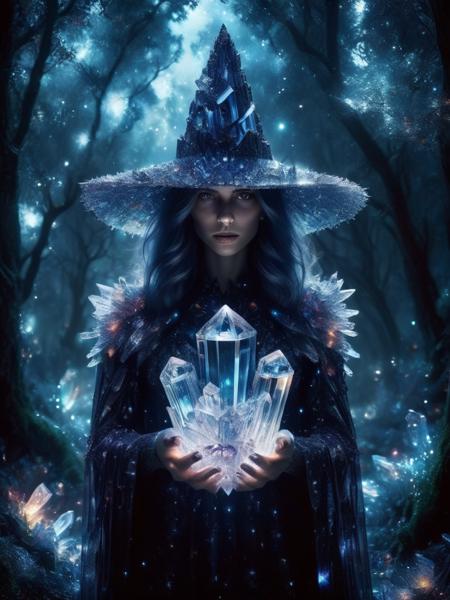 - crystal witch in mystical forrest, god ray from behind, dark night, shiny, crystalz