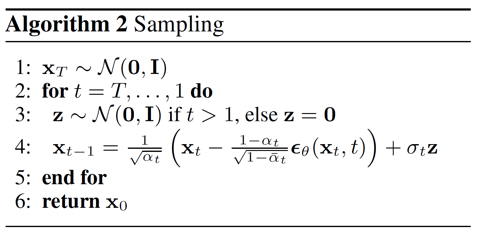 • we sample a noise level tt uniformly between 11 and TT (i.e., a random time step)