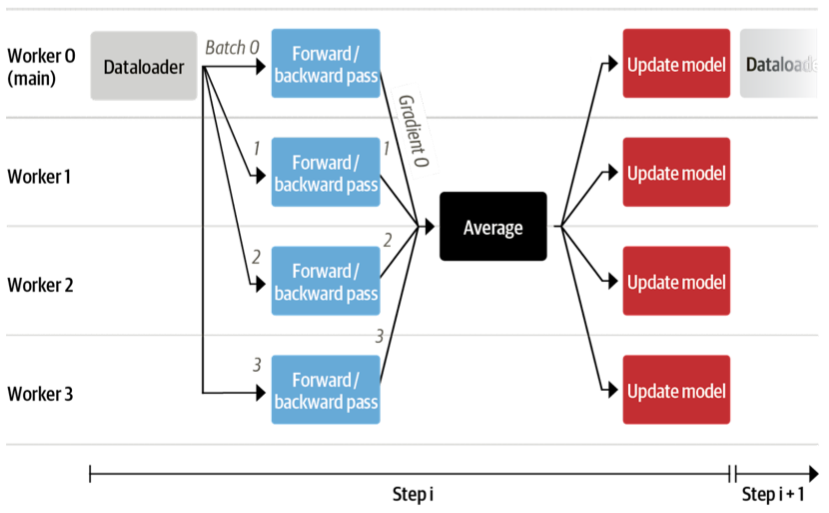 We are now ready to write the main training loop. It will look pretty much like a normal PyTorch training loop. Here and there you can see that we use the accelerator functions rather than native PyTorch. Also, we push the model to the branch after each evaluation.