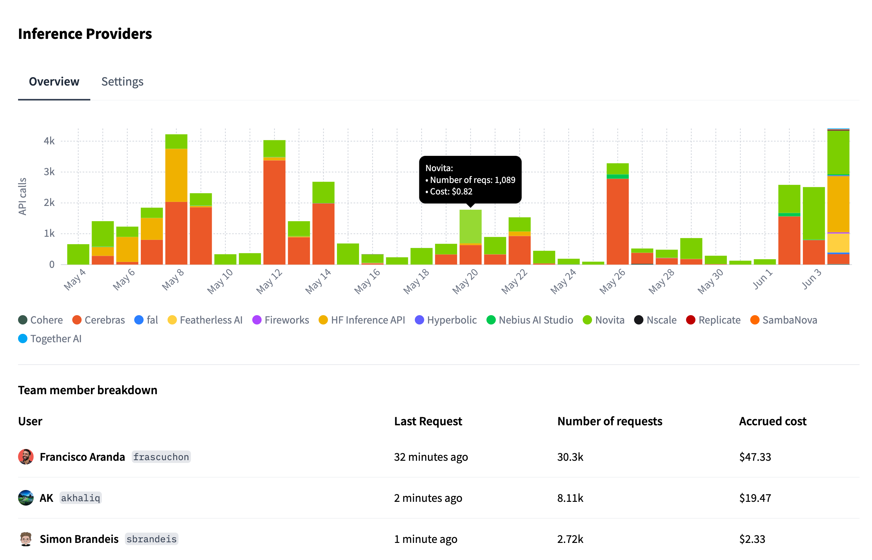 Enterprise organizations now have access to a dedicated Inference Providers dashboard, offering full visibility into team usage across our serverless inference partners. Monitor API call volume over time, explore detailed breakdowns by team member, and track request counts and accrued costs. Accessible via organization settings.