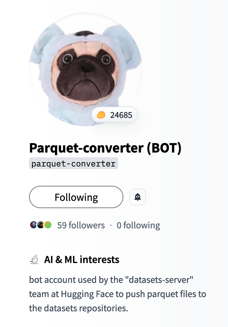 When you create a new dataset, the parquet-converter bot notifies you once it converts the dataset to Parquet. The discussion it opens in the repository provides details about the Parquet format and links to the Parquet files.