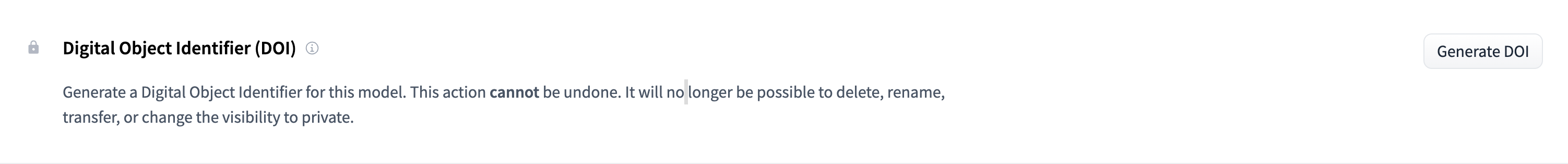 To do this, you must go to the settings of your model or dataset. In the DOI section, a button called “Generate DOI” should appear:
