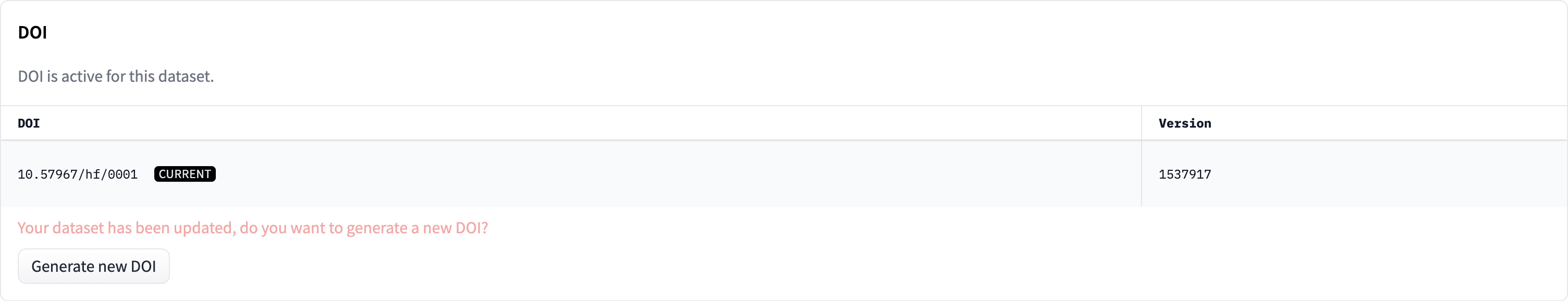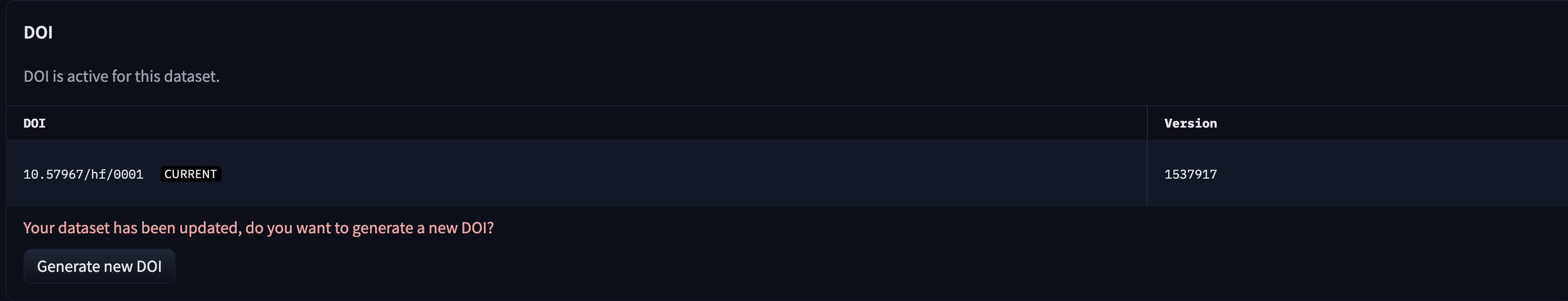 The Hugging Face Hub offers the possibility to generate DOI for your models or datasets. DOIs (Digital Object Identifiers) are strings uniquely identifying a digital object, anything from articles to figures, including datasets and models. DOIs are tied to object metadata, including the object’s URL, version, creation date, description, etc. They are a commonly accepted reference to digital resources across research and academic communities; they are analogous to a book’s ISBN.