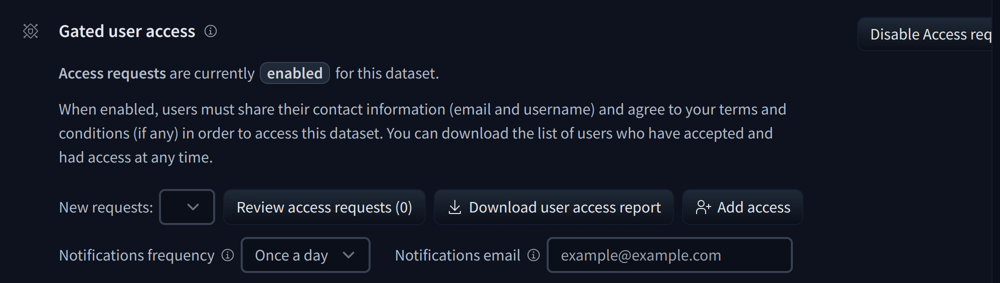 - Notification frequency lets you configure when to get notified if new users request access. It can be set to once a day or real-time. By default, an email is sent to your primary email address. For datasets hosted under an organization, emails are by default sent to the first 5 admins of the organization. In both cases (user or organization) you can set a different email address in the Notifications email field.