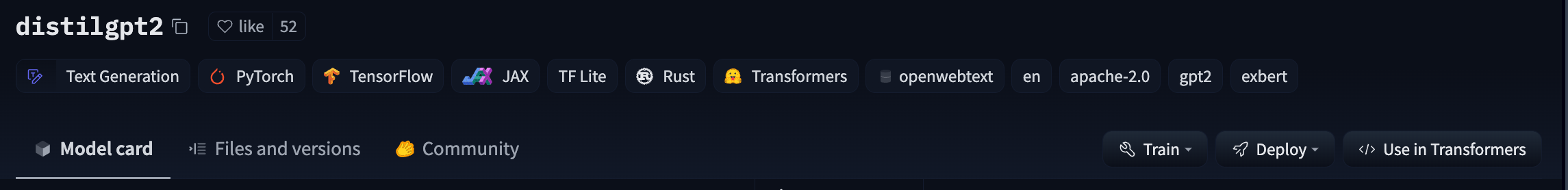 If a model on the Hub is tied to a supported library, loading the model can be done in just a few lines. For information on accessing the model, you can click on the “Use in Library” button on the model page to see how to do so. For example, distilbert/distilgpt2 shows how to do so with 🤗 Transformers below.