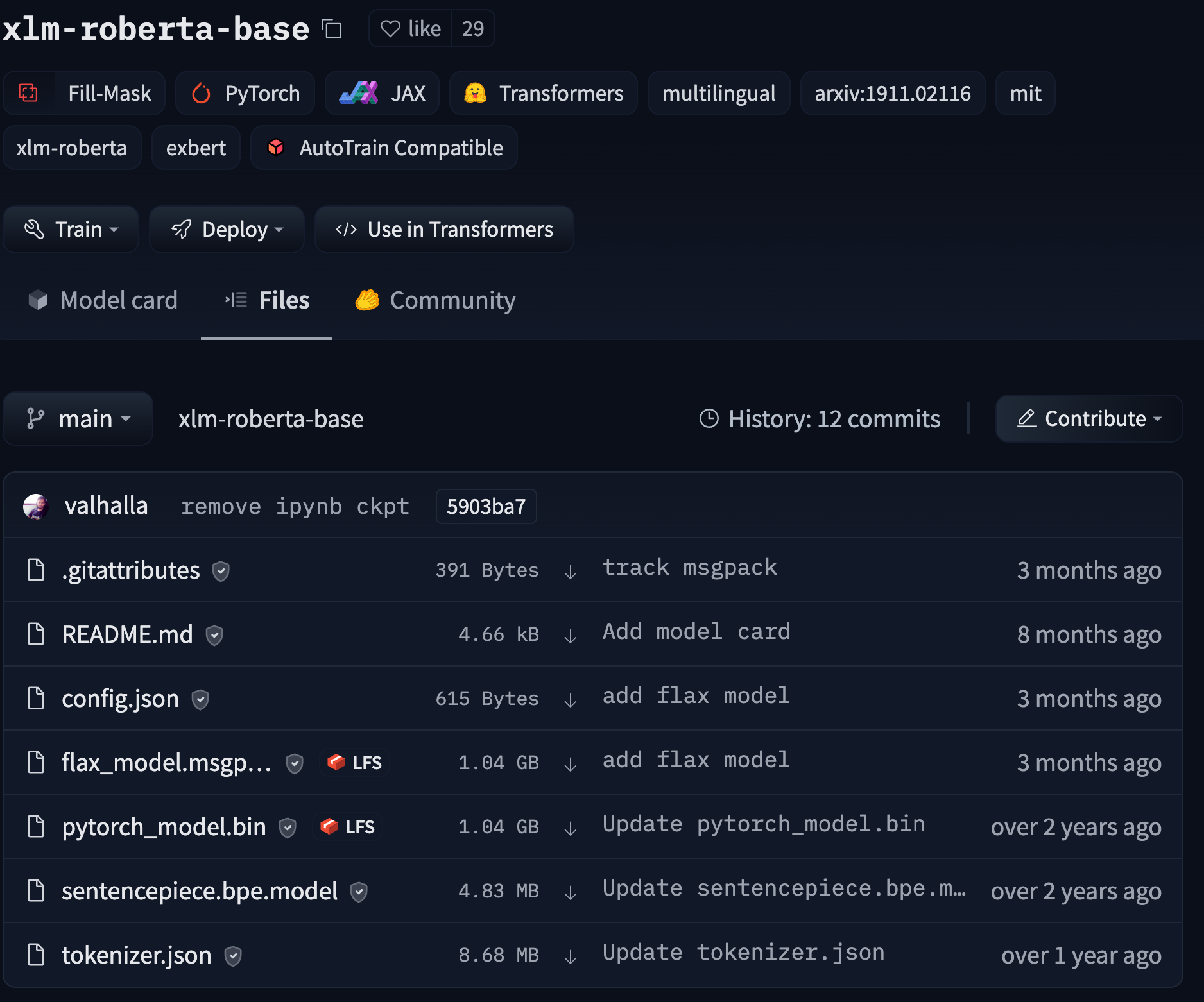 The UI allows you to explore the model files and commits and to see the diff introduced by each commit: