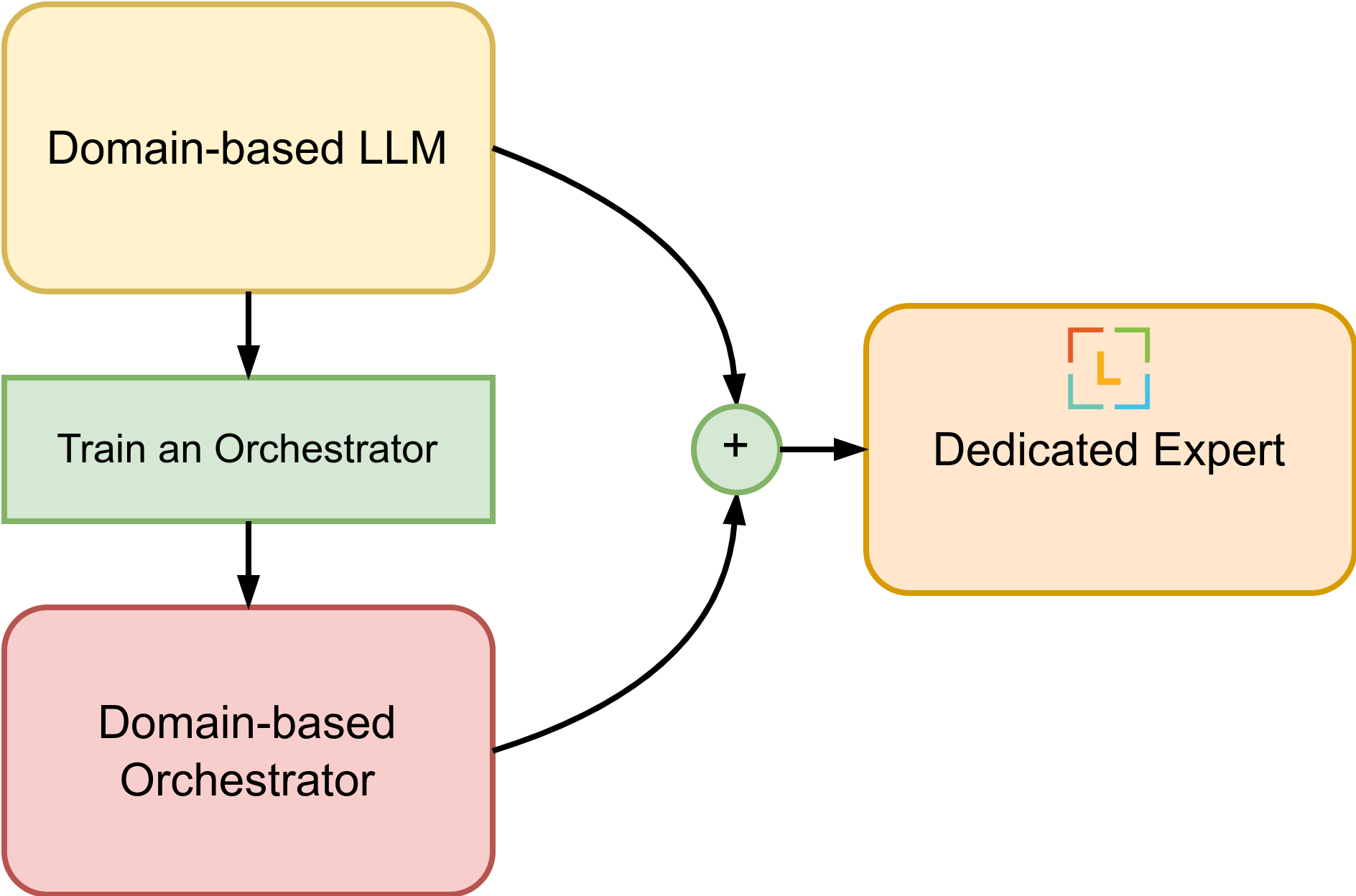 The Orchestrator is first trained to estimate the knowledge of the base model, for any given query, then we marge into the base model (MetaMath7b, here).
