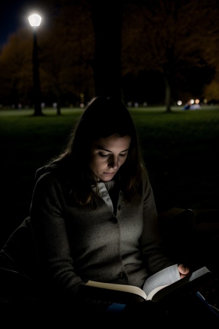 woman reading a book in the park, flashlight , close up