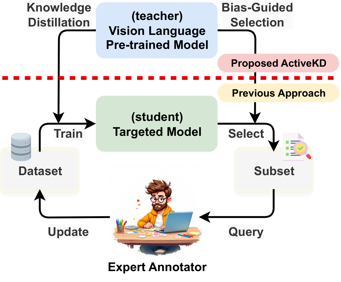 ActiveKD integrates active learning with knowledge distillation using large vision-language models to efficiently select diverse, unlabeled samples for annotation.