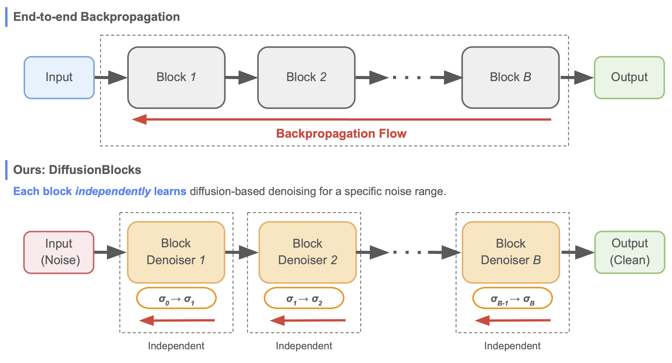 We propose DiffusionBlocks, a novel training framework that eliminates end-to-end backpropagation by interpreting neural network blocks as denoising operations in a continuous-time diffusion process.